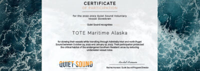 TOTE receives the certificate of recognition from Quiet Sound Voluntary Vessel Slow-down, our participation protected habitats and reduced underwater noise.