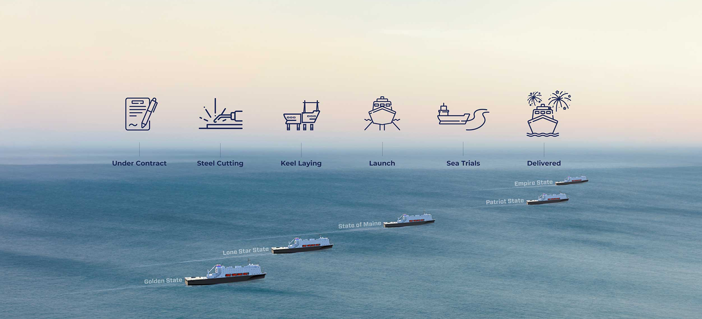 In September 2023, the first National Security Multi-Mission Vessel, Empire State, was delivered in 41 months for the State University of New York Maritime Academy. Next, the Patriot State was delivered in September 2024 for Massachusetts Maritime Academy then the State of Maine for Maine Maritime Academy, Lone Star State for Texas A&M University Maritime Academy and the final national security vessel of this class, the Golden State, will be delivered for California State Maritime Academy between 2025 and 2027 respectively.